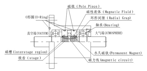 • 磁流體密封原理:磁流體密封技術(shù)就是利用磁流體對(duì)磁場(chǎng)的良好響應(yīng)特性而實(shí)現(xiàn)的。當(dāng)把磁流體注入到由高性能的磁鐵,導(dǎo)磁良好的極靴與旋轉(zhuǎn)軸所構(gòu)成的磁回路間隙中,在磁場(chǎng)的作用下,磁流體在間隙中形成數(shù)個(gè)液態(tài)的“O”形圈,從而起到密封作用。